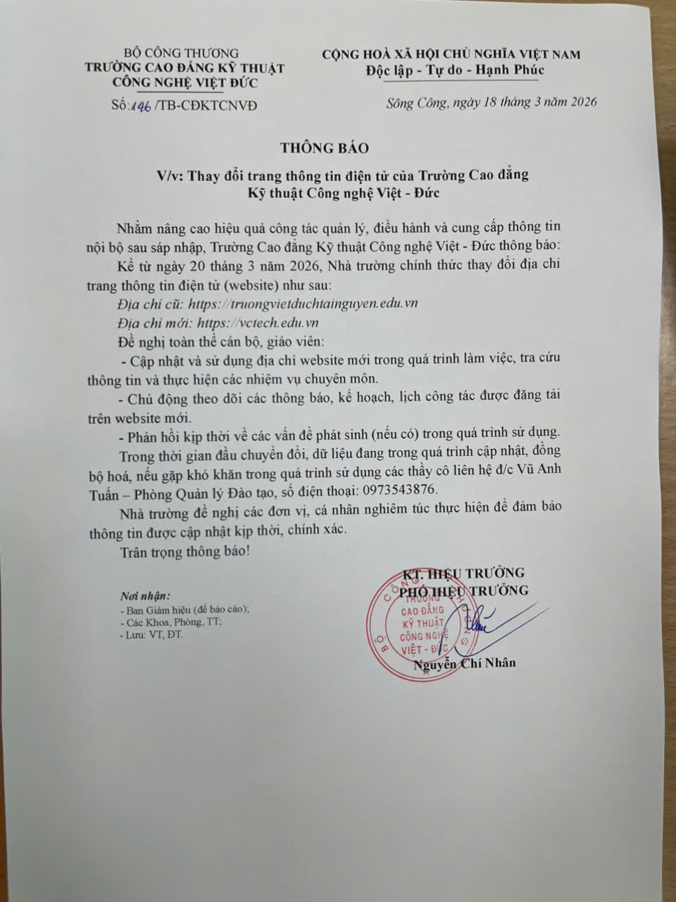 Nhằm nâng cao hiệu quả công tác quản lý, điều hành và cung cấp thông tin nội bộ sau sáp nhập, Trường Cao đẳng Kỹ thuật Công nghệ Việt - Đức thông báo: